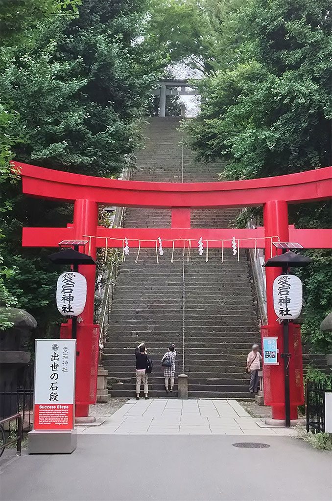 大鳥居の先にある急な石段は「出世の石段」といい、徳川家光の時代に縁がある、登ると出世のご利益がある石段です。