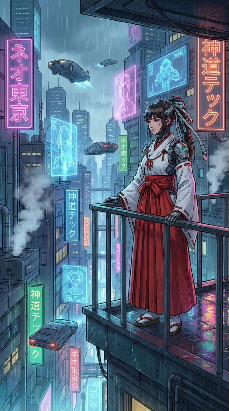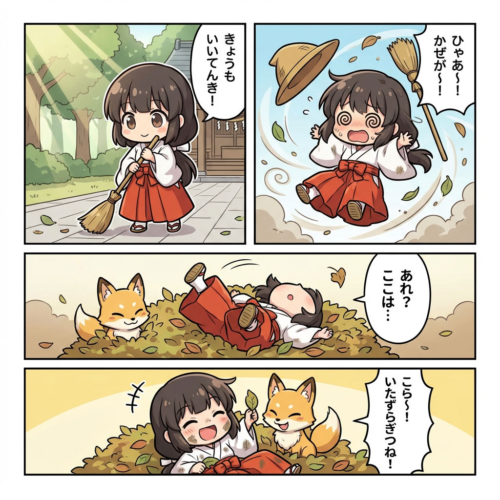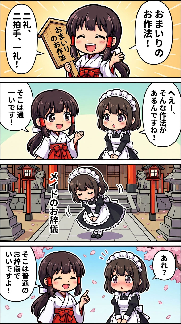 「巫女とメイドの4コマ漫画描いて」と指定したのがこちら。内容はともかくちゃんとマンガが成立してますね。まだ微妙におかしいけど。