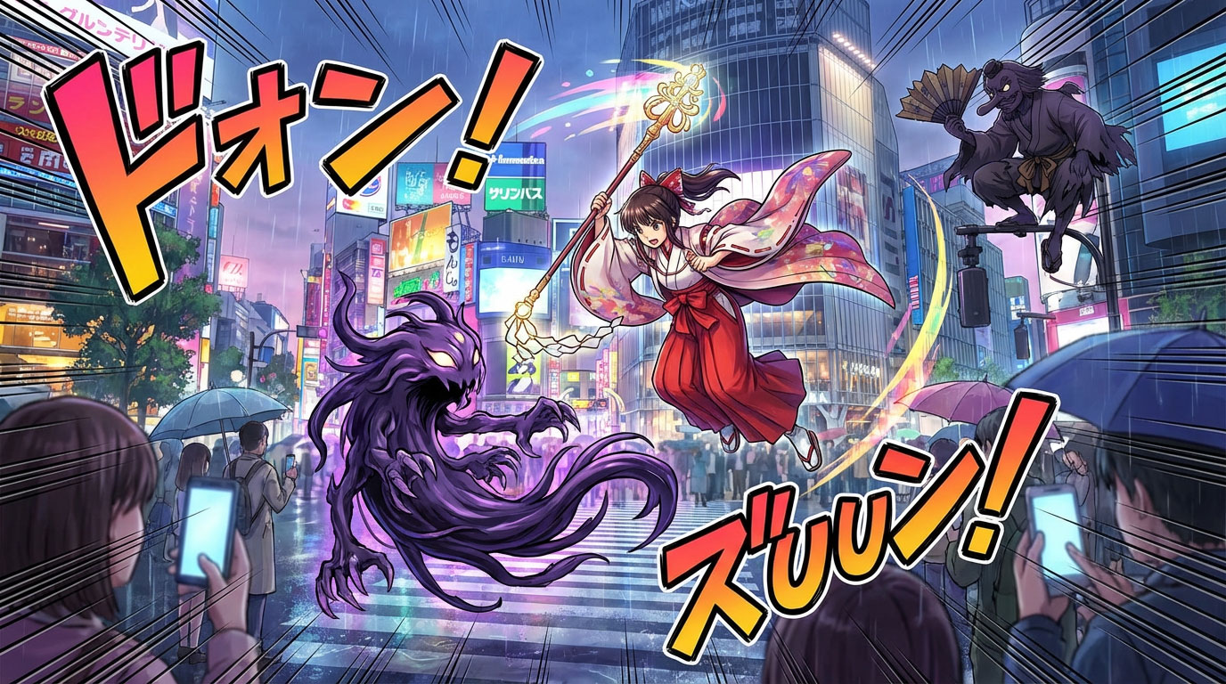 渋谷で妖怪とバトル! 擬音いい感じだけどちょっと英語混じってるな。