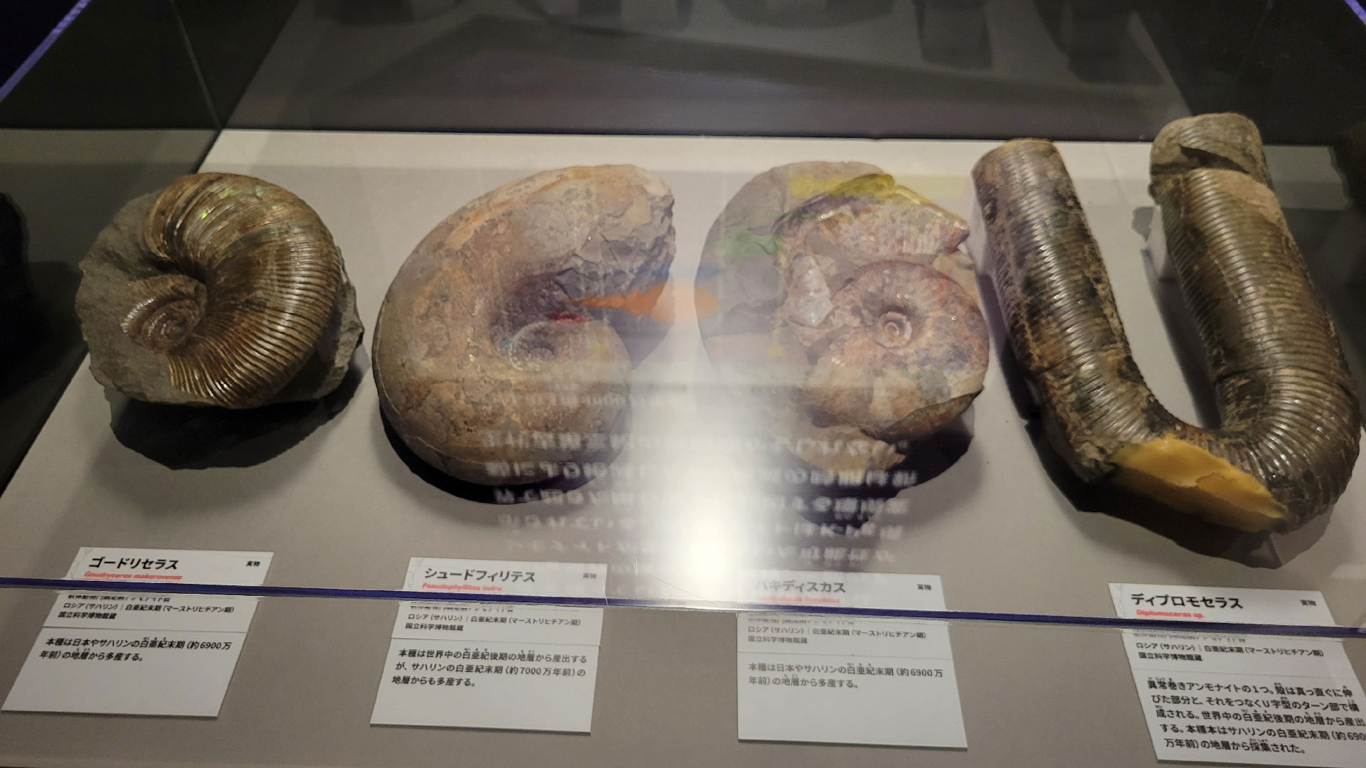 アンモナイト各種。長く存在していたので異常巻きアンモナイトなど変わった形なのも多くいたとか。