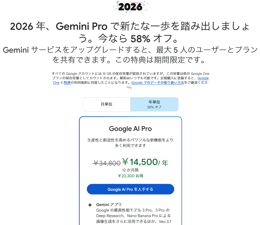 クリスマスイブに開始された「2026年、Gemini Proで新たな一歩を踏み出しましょう。今なら58%オフ」というキャンペーンです。