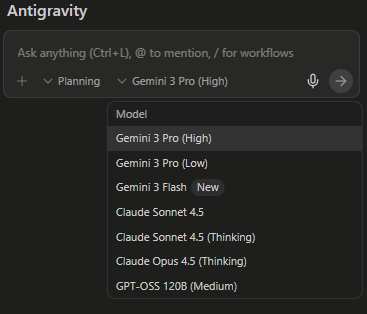 そこに現れたのがAntigravityです。利用制限は5時間ごとにリセットされるので(無料版は1週間ごと)、Cursorみたいに「月末になったら使用を控えよう」といった状況にはなりません。しかもClaude Opus 4.5やGPT-OSSといった他社モデルも使えます。