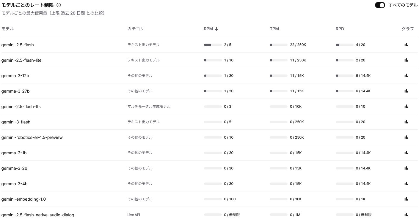 その代わりGemmaは1日14,400回使えます。性能やTPM小さいのが気になるけど数的には十分です。
