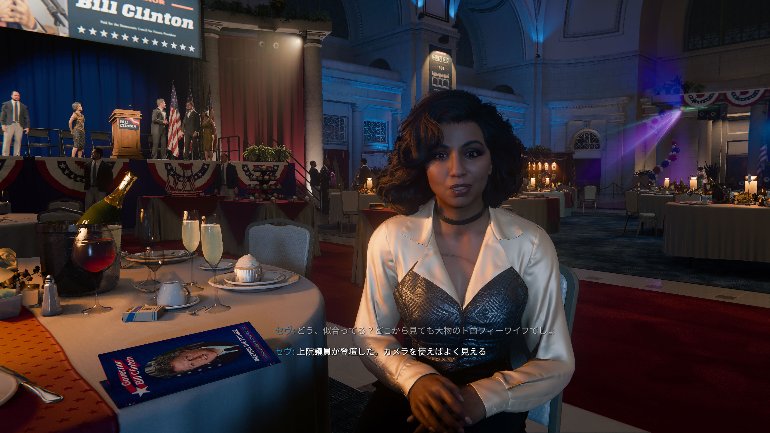 アドラーが捕まってる施設には虹彩スキャナーがあり、突破するためにはマッケナ上院議員の虹彩の写真が必要です。そのためマッケナがいるビル・クリントンの政治資金パーティーに潜入しました。クリントン大統領とは大物が来たね。